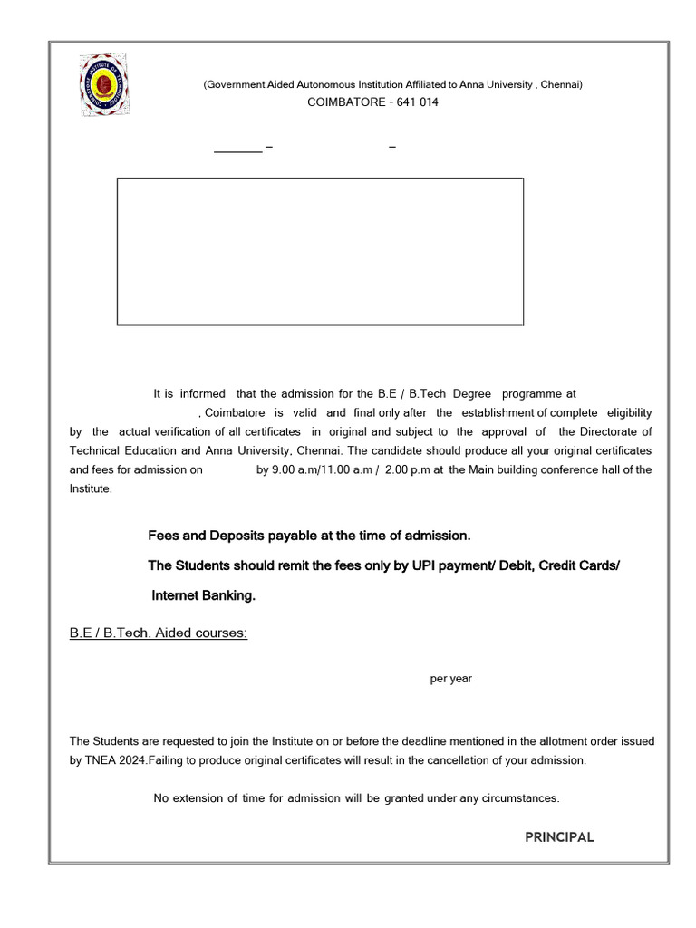 Institute of Technology, Coimbatore is valid and final only after the establishment of complete eligibility
