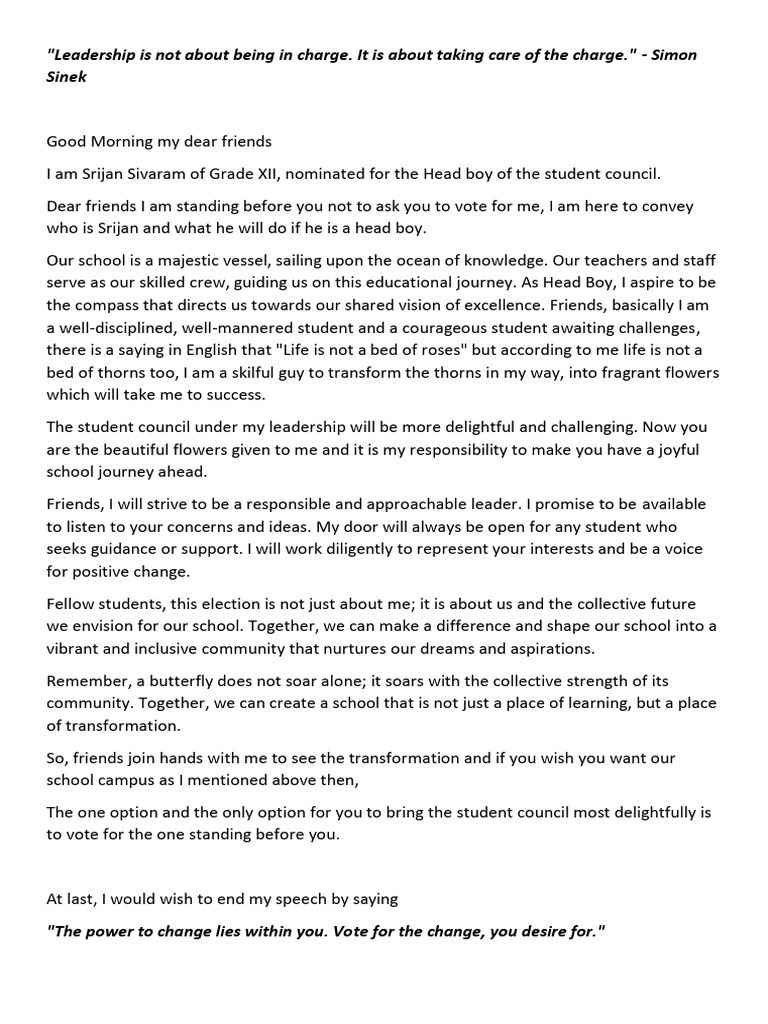 I am Srijan Sivaram of Grade XII, nominated for the Head boy of the student council.