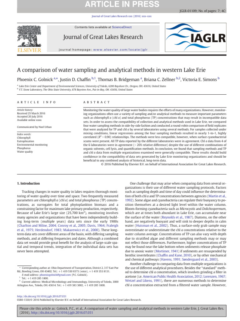 tors when deciding on which method to use to collect water samples. parameters. J. Great Lakes Res. 33, 519–535.