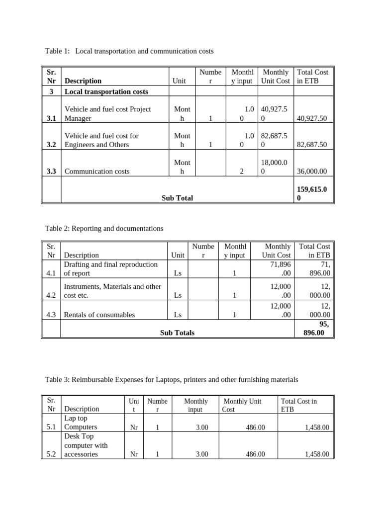 Table 3: Reimbursable Expenses for Laptops, printers and other furnishing materials