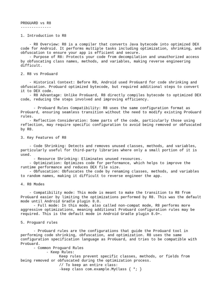 - R8 Overview: R8 is a compiler that converts Java bytecode into optimized DEX