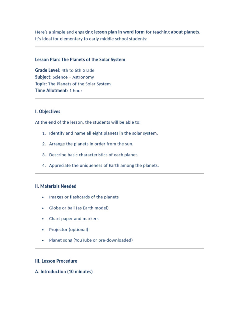 Here’s a simple and engaging lesson plan in word form for teaching about planets.