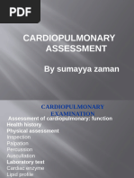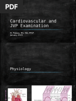 -Below sternal border =5cm, add measure of 8cm (ex), actual JVD est. is 13cm = CVP reading, fluid volume status -Hepatojugular reflex: pushing on liver causes distention of jugular veins Indication of RVHF -Kussmaulss sign: Increase in JVD with deep inspiration. -Seen with RVHF, RV MI, or constrictive pericarditis PALPATION: peripheral pulses and temperature, cap refill, PMI (pt.max impulse) diffuse and shifts L or R with HF/hypertrophy, thrills in renal pts(bruits w/ renal & carotid arterial stenosis), hepatosplenomegaly, H-J reflex AUSCULTATION: Know APETM! Ape to man (aortic, pulmonic, erbs point, tricuspid, mitral) -Stenosis: old and creaky when it should be open -Regurg/Prolapse: open valve when it is supposed to be closed. -S1 closure of TV & MV, heard best at the apex with the bell, NORMAL. -S2 closure of PV & AV, heard best at the base with the diaphragm, NORMAL. -S3 CHF, heard best at the apex with the bell, ABNORMAL, temporary. (occurs in failure d/t rapid ventricular filling into a heart full of too much blood, early diastole) -S4 HTN or MI, heard best at the apex with the bell, ABNORMAL, permanent. (non-compliant ventricle (doesnt want to stretch), myopathy, if atria contract to push blood and ventricle is noncompliant we hear S4, late diastole) Cardiac Cycle: Rapid A-to-V filling (75%), Atria contract atrial kick (25%), MV and TV close (S1 heart sound), DURING DIASTOLE is when the heart gets its blood supply!! (AHANormal resting BP is 120/80) **Know your patients baselines!!!!!!!!!!!!!!!!!!!!! -Ventricles eject blood into pulmonary and systemic vasculature this is when we get O2! (body) -SYSTOLE occurs between S1 and S2 -Diastole occurs between S2 and S3 -An S3 would occur AFTER S2..An S4 sound would occur before S1 MURMURS: -Document them! Where do you hear it best? When in the cardiac cycle, systole or diastole? -What is the valve SUPPOSED to be doing at that time? -STENOSIS valves dont want to open. If the valve is supposed to be open and you hear a murmur? stenosis -REGURGANT valves dont want to stay closed. If its supposed to stay closed and you hear a murmur? it is a regurgant/incompetent/insufficient valve. Also referred to as prolapse - SEE pg. 22 in NOTES FOR MITRAL STENOSIS AND GRADING HEART MURMURS!!!!!!!!!!!!!!!!!!! -With grading heart murmurs, we probably will not hear anything graded 1-3. RUBS: -Inflammation of the pericardium -Have the patient hold their breath, if the rub disappears, then it is pleural friction. -If the sound remains, it is a pericardial rubYou MUST determine whether it is pleural or pericardial! ******-Rub increases when pt sits upright and leans forward with inspiration (these pts wont be comfy lying down) BLOOD PRESSURE: -Take in both arms in cardiac patients, then use arm with higher BP, may have PICCs or shunts.figure it out. -Always confirm a low BP before treating, and compare with a manual. -BP is the fastest, non-invasive, objective way to measure and assess cardiac output. -Check for pulse paradoxus (cardiac tamponade). - No real of very low diastole = ARV (aortic valve regurg) or AI. -With decreased CO, blood is shunted from GI and Renal so UOP is decreased. -If theyre hard to get, go slow with irregular HRs, elevate arm, inflate, lower arm, deflate. BRUITS: -Occur d/t turbulent blood flow through a vessel, associated with atherosclerosis -Carotids: risk for CVA, stroke -Abdomen: possible AAA (abdominal aortic aneurism) lack of integrity in wall of aorta related to high pressures -Renal: renal artery stenosis associated with ARF
