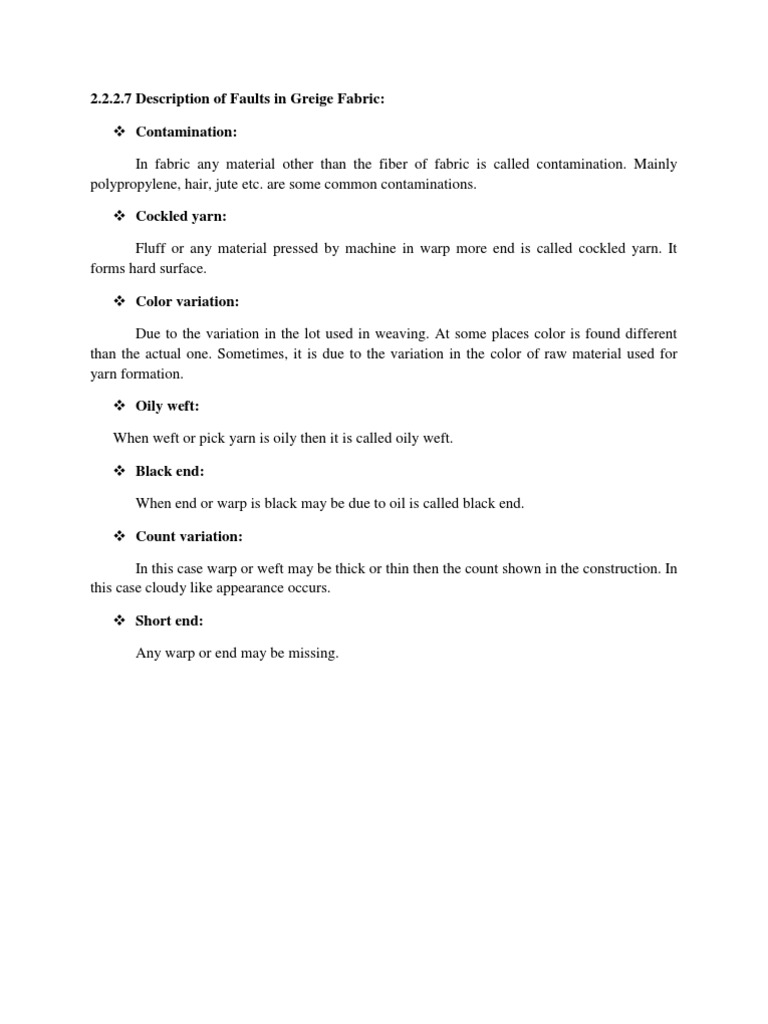 Kinks: When new yarn is knocked either on warp or weft side it is pressed and become hard and swollen. Loose ends: Warp or end comes out of fabric and not properly stitched, so it does not look straight and forms in zigzag way. Sizing Stain: It is like oily stain but more opaque than oily stain. Hanging thread: Any thread hanging in the fabric is called hanging thread or Mending Mark: If Slub is taken out or kink is pulled out then a space appears in fabric and called mending fault.