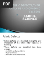 Penalty points grading: The following fabric penalty point grading standards are to be used during inspection. 1. No more than 4 penalty points may be assigned for any single defect. 2. No more than 4 penalty points may be assigned to one linear meter, regardless of the number of defects with in that one meter. 3. A continuous defect shall be assigned 4 points for each meter in which it occurs. 4. Any roll having a running defect through more than three continuous meters shall be rejected regardless of points count. 5. Any roll with a full width defect over six inches in length shall be rejected. 6. Any roll that contains more than four fall width defects per one hundred linear meters shall be rejected. 7. No roll shall be accepted that contains a full width defect in the first or last three meters. 8. Fabric width will be checked a minimum of three times during the inspection of a roll (beginning middle and end of the roll.). Roll having a measurement of less that the specified required width shall be graded as second quality. A maximum tolerance of +3 % will be allowed for rolls having a measurement greater that the specified required width. 9. A hole or torn is considered to be a major defect and shall be penalized 4 points. 10. Following defects will be penalized penalty points as per rules. 11. Following defects are cut table and will be reflected. Frequent knits, knots, Slub, contamination, spots etc. More than three meters a continuous defect such as dye creases, streak marks, side center side shading, roll to roll shading, narrow or irregular width, abrasion mark, uneven dye and finish, reed mark, double end, broken end, wrong draw etc. No roll shall be accepted as first quality that exhibits a noticeable degree of looseness of tightness or ripples, puckers, folds or creases in the body of the fabric