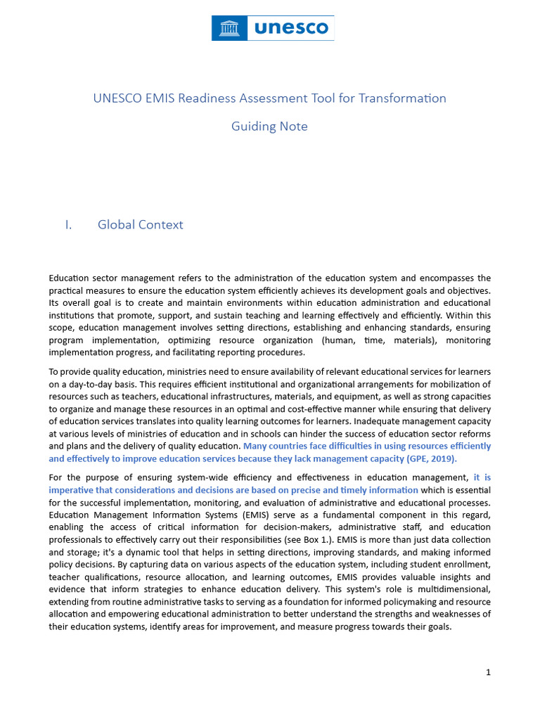 approach to evaluating and advancing the readiness of national EMIS. Before the assessment, the UNESCO