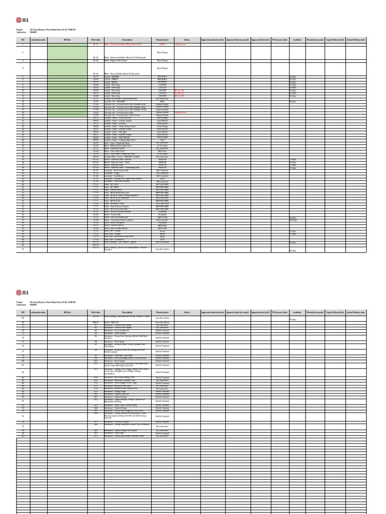 NO submission date RFA No: Mat Code Description Manufacturer Status Approved submision date Approval date by consult Approval date by JLL PO issuance date Leadtime Manufactor period Target Delivery Date Actual Delivery date