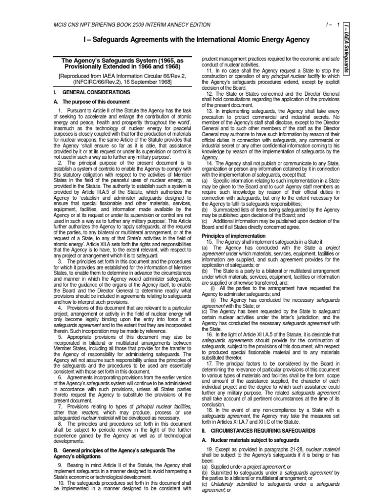 MCIS CNS NPT BRIEFING BOOK 2009 INTERIM ANNECY EDITION jurisdiction or carried out under its control anywhere, for the exclusive purpose of verifying that such material is not diverted to nuclear weapons or other nuclear explosive devices. Application of Safeguards 2. The Agreement should provide for the Agencys right and obligation to ensure that safeguards will be applied, in accordance with the terms of the Agreement, on all source or special fissionable material in all peaceful nuclear activities within the territory of the State, under its jurisdiction or carried out under its control anywhere, for the exclusive purpose of verifying that such material is not diverted to nuclear weapons or other nuclear explosive devices. Co-operation Between the Agency and the State 3. The Agreement should provide that the Agency and the State shall co-operate to facilitate the implementation of the safeguards provided for therein. Implementation of Safeguards 4. The Agreement should provide that safeguards shall be implemented in a manner designed: (a) To avoid hampering the economic and technological development of the State or international co-operation in the field of peaceful nuclear activities, including international exchange of nuclear material; (b) To avoid undue interference in the States peaceful nuclear activities, and in particular in the operation of facilities; and (c) To be consistent with prudent management practices required for the economic and safe conduct of nuclear activities. 5. The Agreement should provide that the Agency shall take every precaution to protect commercial and industrial secrets and other confidential information coming to its knowledge in the implementation of the Agreement. The Agency shall not publish or communicate to any State, organization or person any information obtained by it in connection with the implementation of the Agreement, except that specific information relating to such implementation in the State may be given to the Board of Governors and to such Agency staff members as require such knowledge by reason of their official duties in connection with safeguards, but only to the extent necessary for the Agency to fulfil its responsibilities in implementing the Agreement. Summarized information on nuclear material being safeguarded by the Agency under the Agreement may be published upon decision of the Board if the states directly concerned agree. 6. The Agreement should provide that in implementing safeguards pursuant thereto the Agency shall take full account of technological developments in the field of safeguards, and shall make every effort to ensure optimum cost-effectiveness and the application of the principle of safeguarding effectively the flow of nuclear material subject to safeguards under the Agreement by use of instruments and other techniques at certain strategic points to the extent that present or future technology permits. In order to ensure optimum cost-effectiveness, use should be made, for example, of such means as: (a) Containment as a means of defining material balance points for accounting purposes; (b) Statistical techniques and random sampling in evaluating the flow of nuclear material; and (c) Concentration of verification procedures on those stages in the nuclear fuel cycle involving the production, processing, use or storage of nuclear material from which nuclear weapons or other nuclear explosive devices could readily be made, and minimization of verification procedures in respect of other nuclear material on condition that this does not hamper the Agency in applying safeguards under the Agreement. National System of Accounting for and Control of Nuclear Material 7. The Agreement should provide that the State shall establish and maintain a system of accounting for and control of all nuclear material subject to safeguards under the Agreement, and that such safeguards shall be applied in such a manner as to enable the Agency to verify, in ascertaining that there has been no diversion of nuclear material from peaceful uses to nuclear weapons or other nuclear explosive devices, findings of the States system. The Agencys verification shall include, inter alia, independent measurements and observations conducted by the Agency in