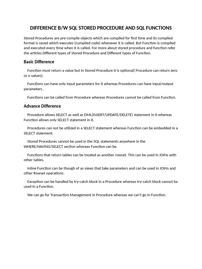 DIFFERENCE B/W SQL STORED PROCEDURE AND SQL FUNCTIONS