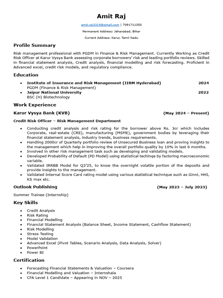 Risk Officer at Karur Vysya Bank assessing corporate borrowers’ risk and leading portfolio reviews. Skilled