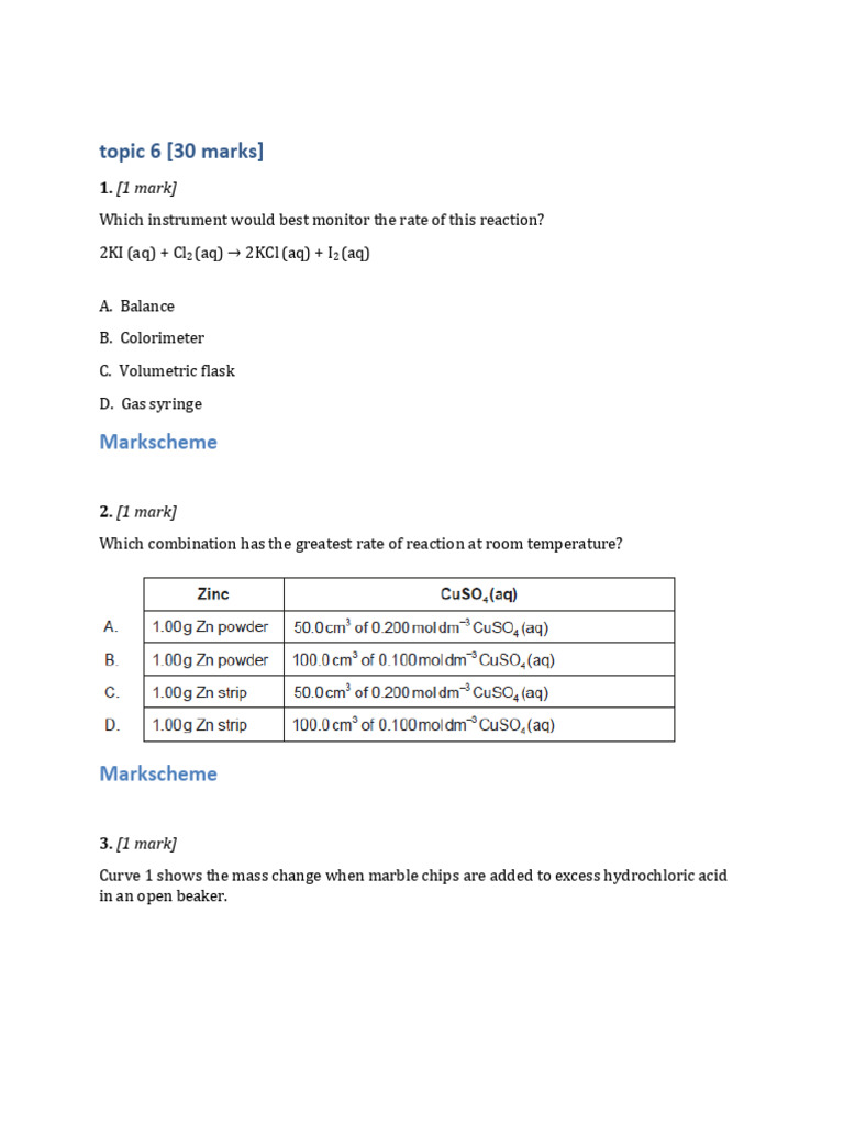 Curve 1 shows the mass change when marble chips are added to excess hydrochloric acid