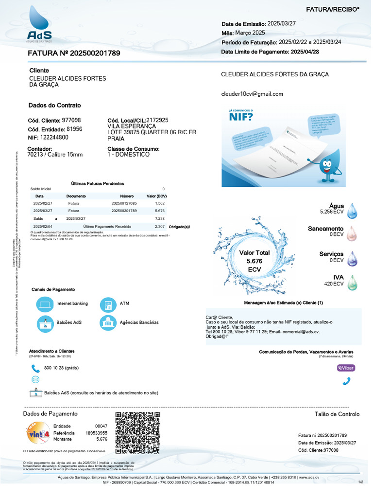 Fatura de Consumo de Água - Praia