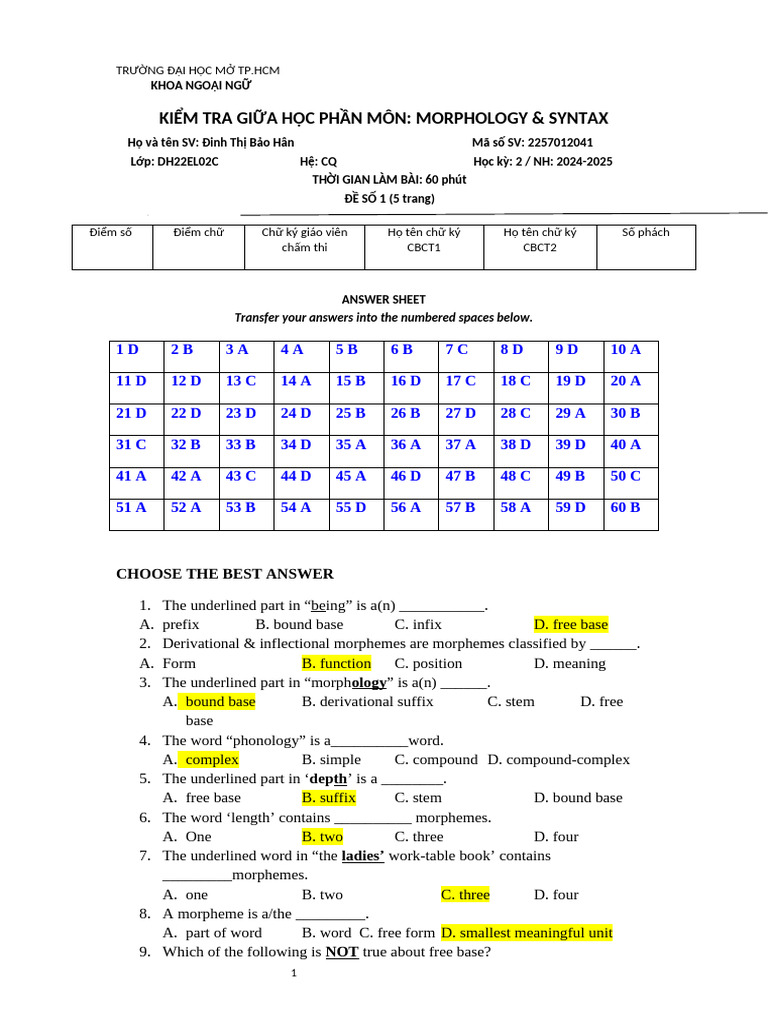 KIỂM TRA GIỮA HỌC PHẦN MÔN: MORPHOLOGY & SYNTAX