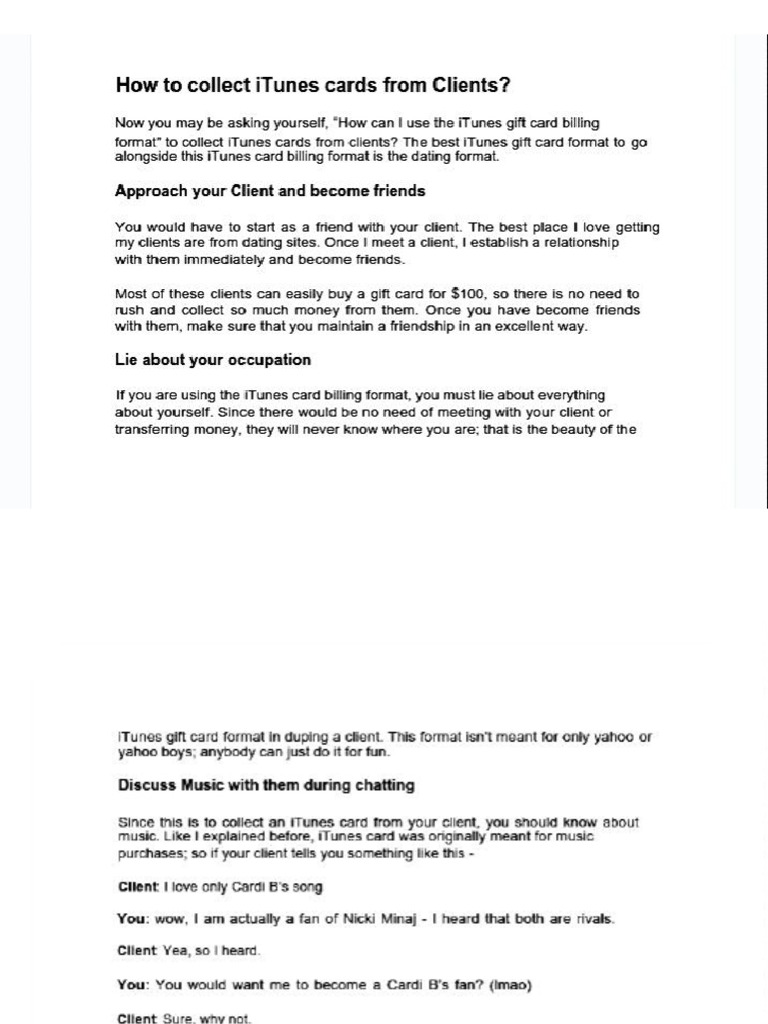 The document provides a guide on how to collect iTunes gift cards from clients by establishing a friendship and using deceptive tactics. It suggests building a rapport through dating sites, lying about one's occupation, and discussing music to create a connection. A sample message is included to illustrate how to solicit gift cards under the guise of needing funds for a camera repair.