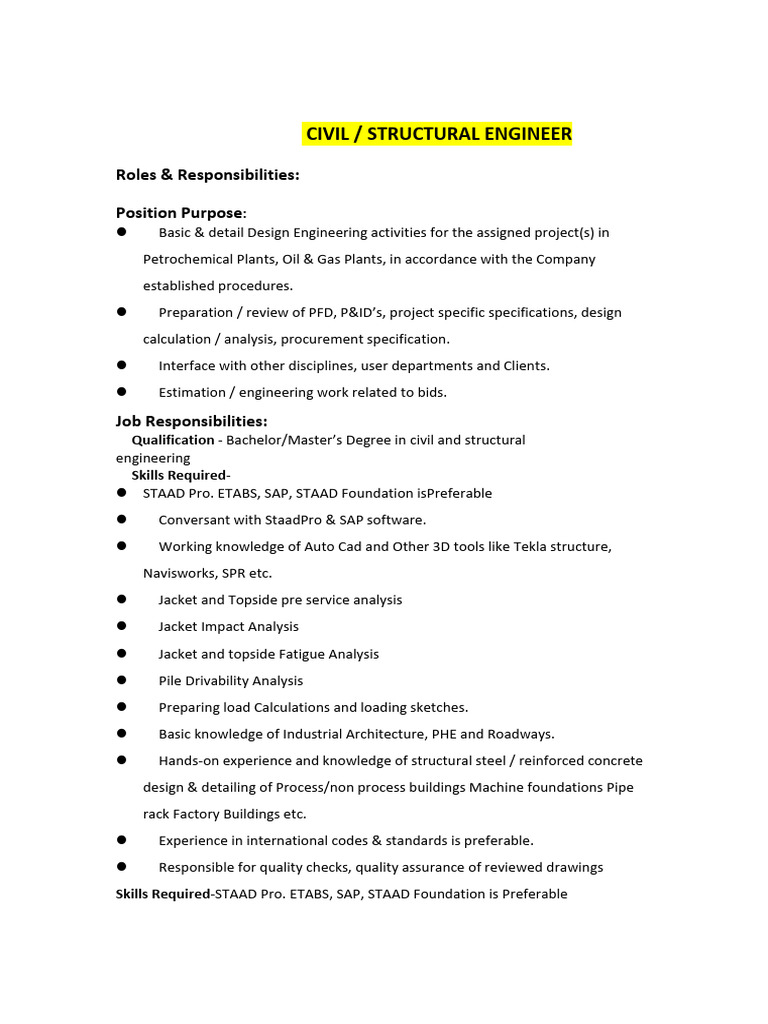 Skills Required-STAAD Pro. ETABS, SAP, STAAD Foundation is Preferable