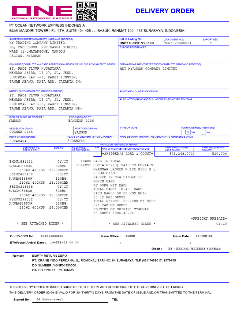 THIS DELIVERY ORDER (D/O) IS VALID FOR 30 (THIRTY) DAYS FROM THE DATE OF ISSUE AND/OR TRANSMITTED TO THE TERMINAL