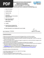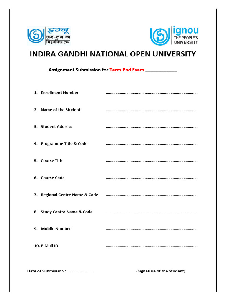 This document is an assignment submission form for the Indira Gandhi National Open University. It requires the student's enrollment number, name, address, program details, course information, contact information, and a signature. The form is to be filled out and submitted for the term-end exam.