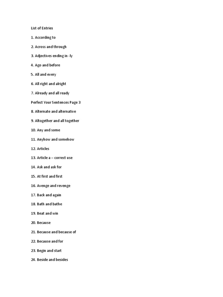 All and every 6. All right and alright 7. Already and all ready Perfect Your Sentences Page 3 8. Alternate and alternative 9. Altogether and all together 10. Any and some 11. Anyhow and somehow 12. Articles 13. Article a correct use 14. Ask and ask for 15. At first and first 16. Avenge and revenge 17. Back and again 18. Bath and bathe 19. Beat and win 20. Because 21. Because and because of 22. Because and for 23. Begin and start 24. Beside and besides