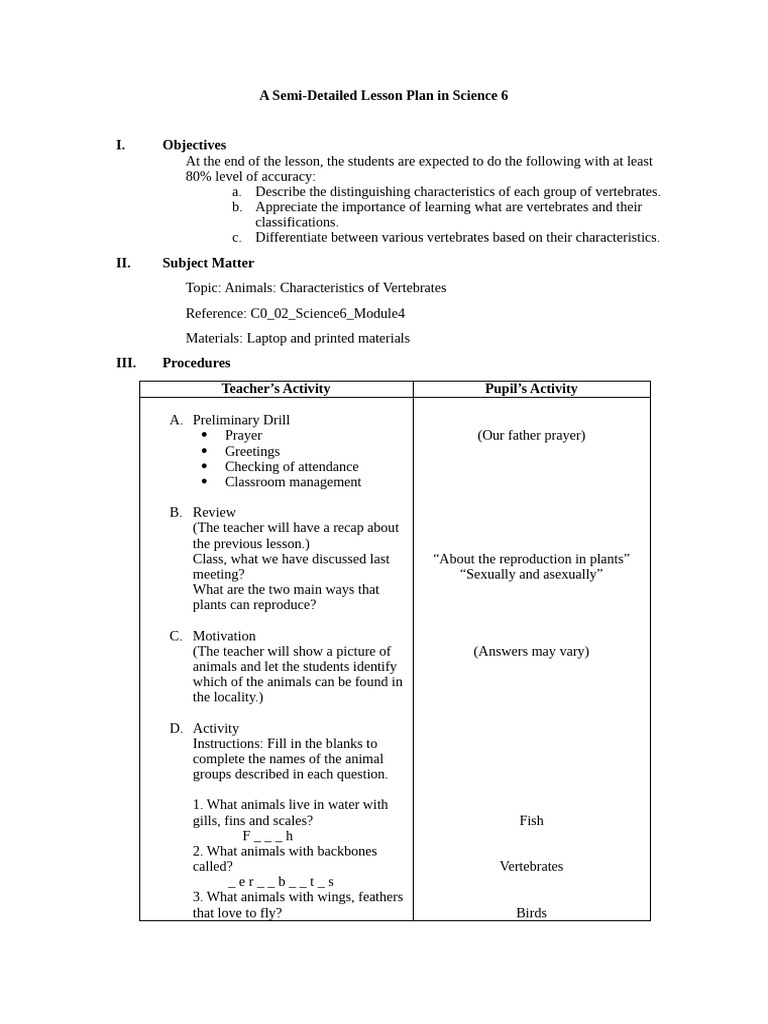 A Semi-Detailed Lesson Plan in Science 6