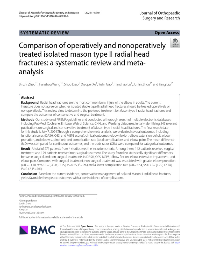 nonoperative treatment of isolated mason type II radial three studies [27–29] involving 84 patients who under-