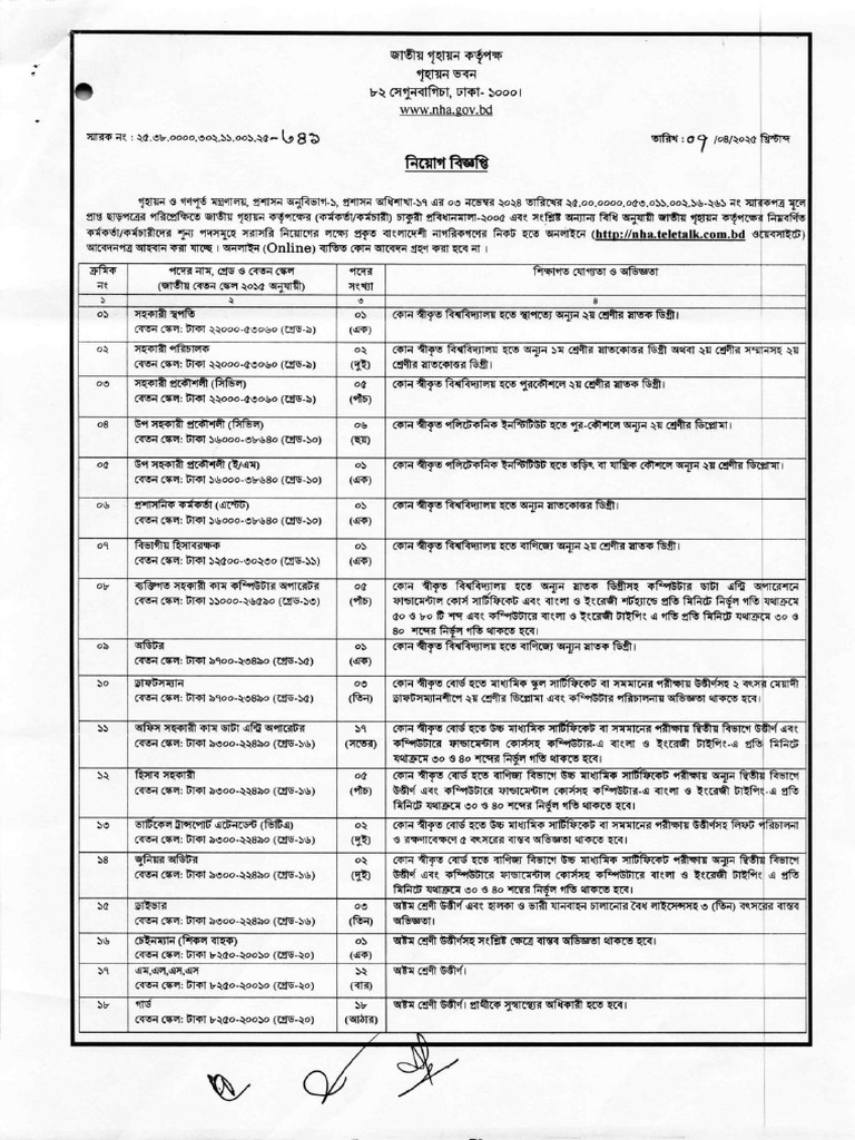 The document appears to be a fragmented and poorly formatted text related to an application process for a position at the National Housing Authority (NHA) in Bangladesh. It includes references to online application procedures, SMS notifications, and various codes, but lacks coherent structure and clarity. Overall, it seems to provide instructions for applicants regarding submission and payment details, but is difficult to interpret due to its disorganized presentation.