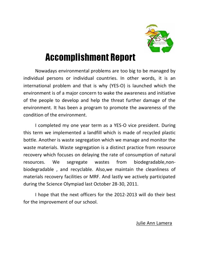 Nowadays environmental problems are too big to be managed by individual persons or individual countries. In other words, it is an international problem and that is why (YES-O) is launched which the environment is of a major concern to wake the awareness and initiative of the people to develop and help the threat further damage of the environment. It has been a program to promote the awareness of the condition of the environment. I completed my one year term as a YES-O vice president. During this term we implemented a landfill which is made of recycled plastic bottle. Another is waste segregation which we manage and monitor the waste materials. Waste segregation is a distinct practice from resource recovery which focuses on delaying the rate of consumption of natural resources. We segregate wastes from biodegradable,nonbiodegradable , and recyclable. Also,we maintain the cleanliness of materials recovery facilities or MRF. And lastly we actively participated during the Science Olympiad last October 28-30, 2011. I hope that the next officers for the 2012-2013 will do their best for the improvement of our school.