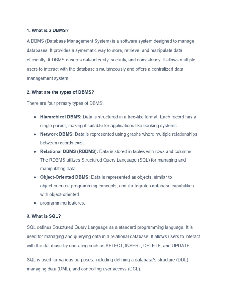 efficiently. A DBMS ensures data integrity, security, and consistency. It allows multiple
