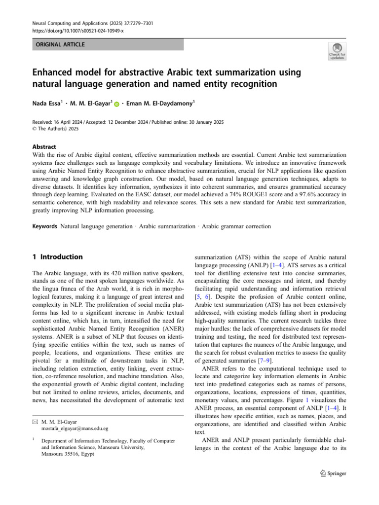 mony; M.M.El-Gayar and N.Essa contributed to formal analysis; approaches for abstractive summarization of low resource lan-
