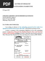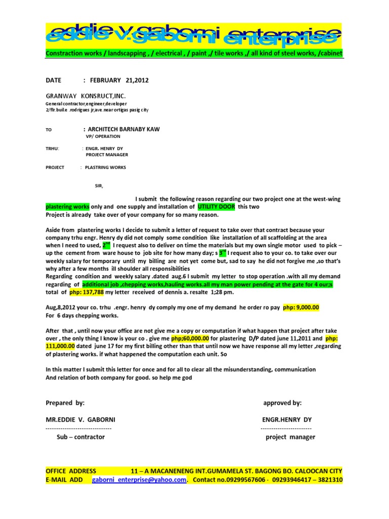 I submit the following reason regarding our two project one at the west-wing plastering works only and one supply and installation of UTILITY DOOR this two Project is already take over of your company for so many reason. Aside from plastering works I decide to submit a letter of request to take over that contract because your company trhu engr. Henry dy did not comply some condition like installation of all scaffolding at the area nd when I need to used, 2 I request also to deliver on time the materials but my own single motor used to pick rd up the cement from ware house to job site for how many day; s 3 I request also to your co. to take over our weekly salary for temporary until my billing are not yet come but, sad to say he did not forgive me ,so thats why after a few months ill shoulder all responsibilities Regarding condition and weekly salary .dated aug.6 I submit my letter to stop operation .with all my demand regarding of additional job ,chepping works,hauling [Link] my man power pending at the gate for 4 our;s total of php: 137,788 my letter received of dennis a. resalte 1;28 pm. Aug,8,2012 your co. trhu .engr. henry dy comply my one of my demand he order ro pay php: 9,000.00 For 6 days chepping works. After that , until now your office are not give me a copy or computation if what happen that project after take over , the only thing I know is your co . give me php;60,000.00 for plastering D/P dated june 11,2011 and php: 111,000.00 dated june 17 for my first billing other than that until now we have response all my letter ,regarding of plastering works. if what happened the computation each unit. So In this matter I submit this letter for once and for all to clear all the misunderstanding, communication And relation of both company for good. so help me god