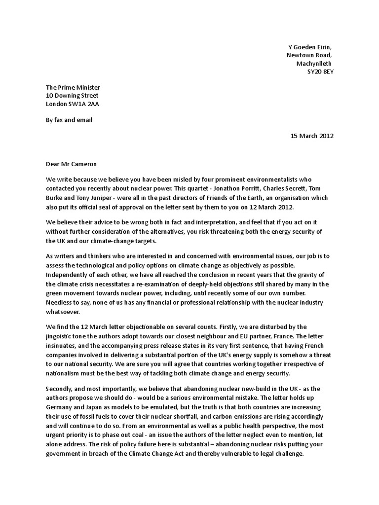 Y Goeden Eirin, Newtown Road, Machynlleth SY20 8EYThe Prime Minister10 Downing Street London SW1A 2AABy fax and email15 March 2012Dear Mr CameronWe write because we believe you have been misled by four prominent environmentalists who contacted you recently about nuclear power. This quartet - Jonathon Porri, Charles Secre, Tom Burke and Tony Juniper - were all in the past directors of Friends of the Earth, an organisaon which also put its ocial seal of approval on the leer sent by them to you on 12 March 2012. We believe their advice to be wrong both in fact and interpretaon, and feel that if you act on it without further consideraon of the alternaves, you risk threatening both the energy security of the UK and our climate-change targets.As writers and thinkers who are interested in and concerned with environmental issues, our job is to assess the technological and policy opons on climate change as objecvely as possible. Independently of each other, we have all reached the conclusion in recent years that the gravity of the climate crisis necessitates a re-examinaon of deeply-held objecons sll shared by many in the green movement towards nuclear power, including, unl recently some of our own number. Needless to say, none of us has any nancial or professional relaonship with the nuclear industry whatsoever.We nd the 12 March leer objeconable on several counts. Firstly, we are disturbed by the jingoisc tone the authors adopt towards our closest neighbour and EU partner, France. The leer insinuates, and the accompanying press release states in its very rst sentence, that having French companies involved in delivering a substanal poron of the UK's energy supply is somehow a threat to our naonal security. We are sure you will agree that countries working together irrespecve of naonalism must be the best way of tackling both climate change and energy security. Secondly, and most importantly, we believe that abandoning nuclear new-build in the UK - as the authors propose we should do - would be a serious environmental mistake. The leer holds up Germany and Japan as models to be emulated, but the truth is that both countries are increasing their use of fossil fuels to cover their nuclear shorall, and carbon emissions are rising accordingly and will connue to do so. From an environmental as well as a public health perspecve, the most urgent priority is to phase out coal - an issue the authors of the leer neglect even to menon, let alone address. The risk of policy failure here is substanal – abandoning nuclear risks pung your government in breach of the Climate Change Act and thereby vulnerable to legal challenge.