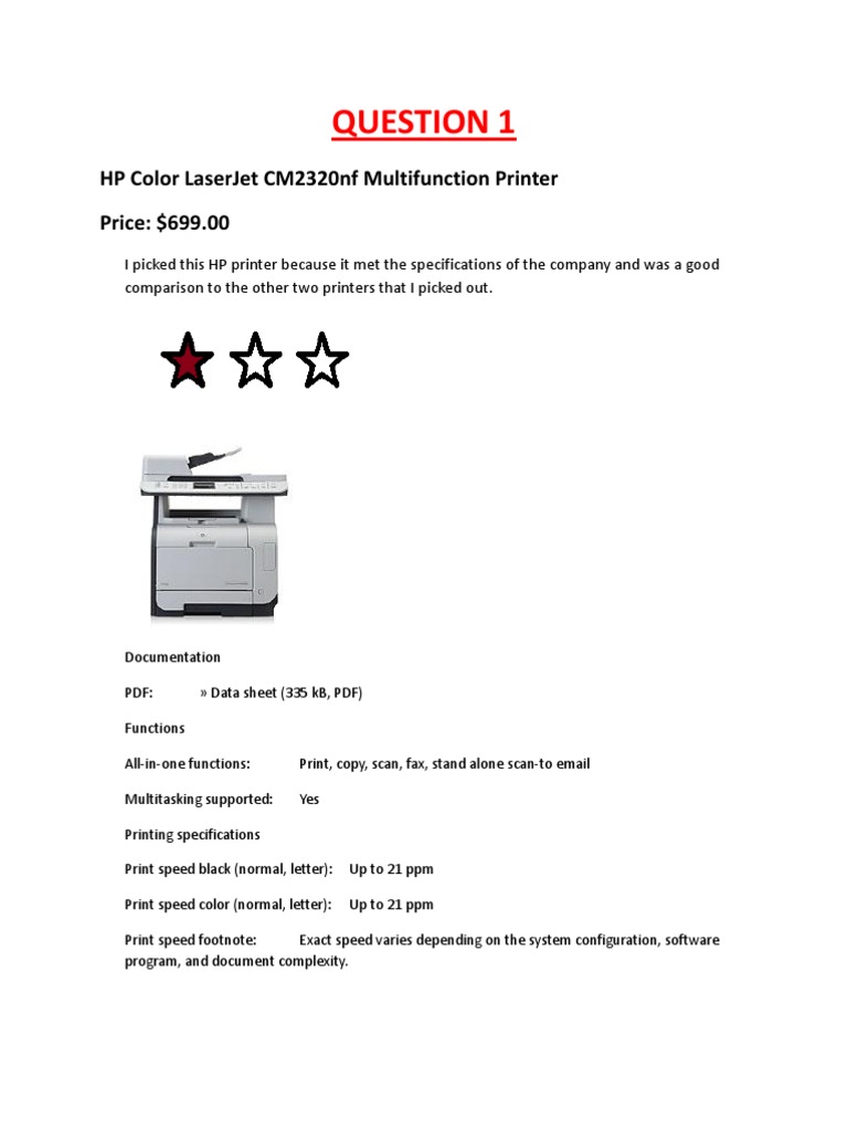 Research a Color LaserJet printer for a small business office setting. There are 15 employees who will need access to this printer. Currently they have a network environment. This printer will be setup directly onto the network. The functions they are looking for are Printing and Duplexing. They are printing 28 pages per minute. They will also need three printer input trays. They print anything from larger documents with graphics which will require a minimum of 1 Gig of Ram. The Print volume for each month is 5000 pages. The Print quality minimum is 600 dpi. The customer has budgeted $3000.00 for this purchase. Choose three color Laser printers that would work for this customer using three vendors. Print out all three with the specifications listed above. Explain each of your choices for the Color LaserJet printer; also include the rating from 1 to 3.