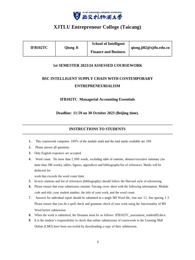 Coursework Assessment: Integrative Management Accounting Analysis