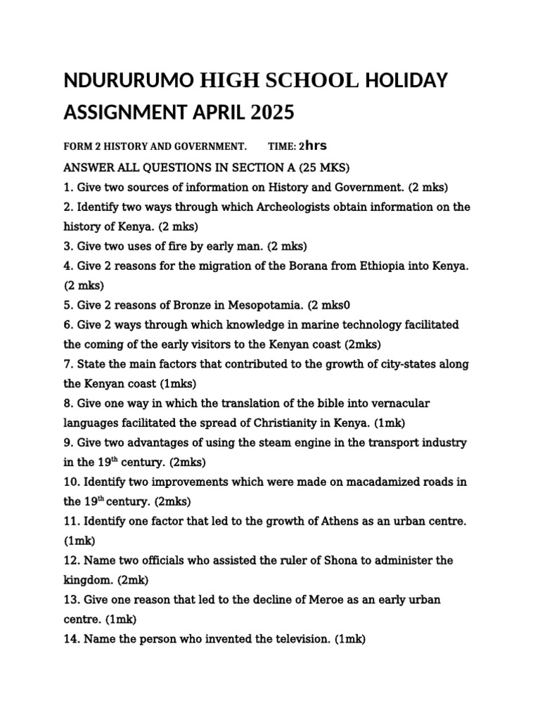 FORM 2 HISTORY AND GOVERNMENT. TIME: 2hrs