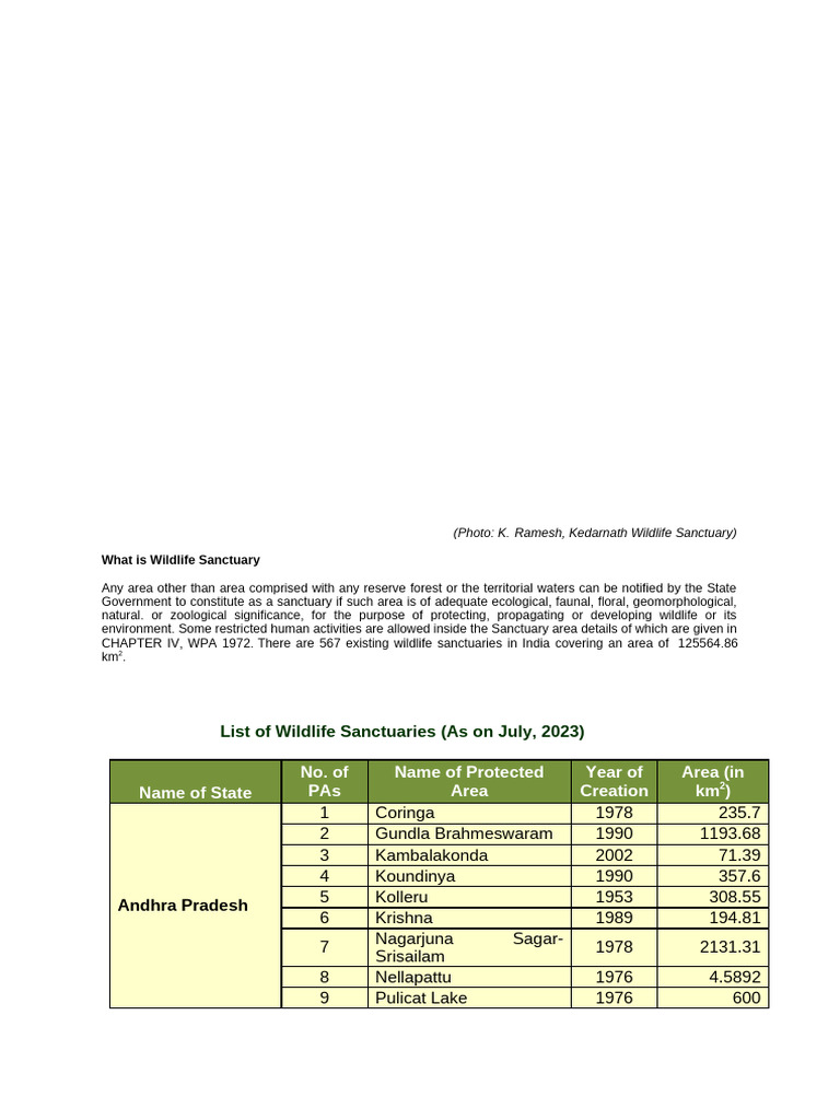 List of Wildlife Sanctuaries (As on July, 2023)
