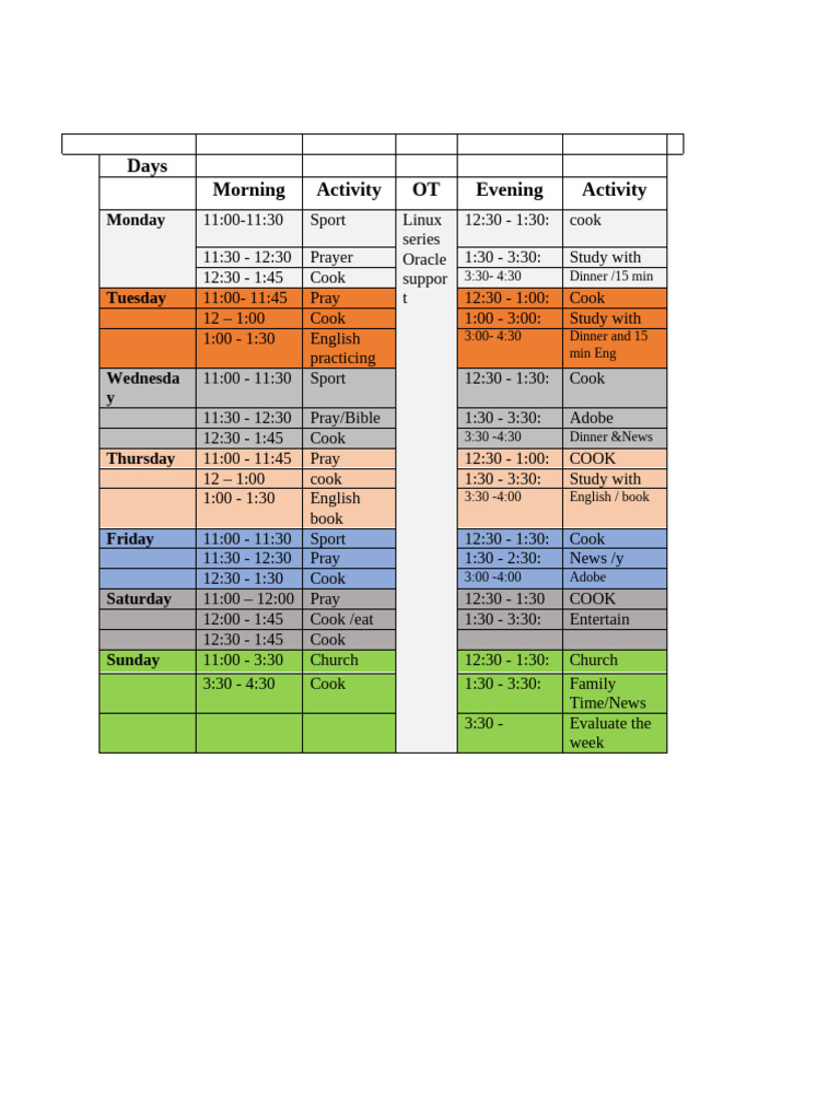 Tuesday 11:00- 11:45 Pray t 12:30 - 1:00: Cook