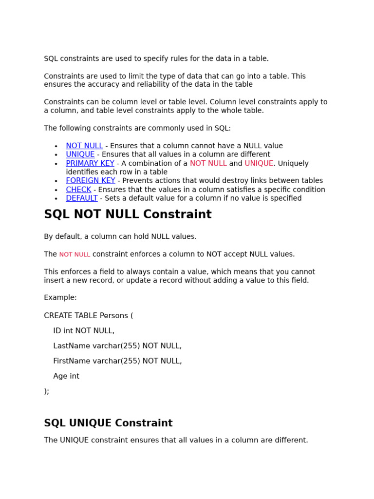 The following constraints are commonly used in SQL: