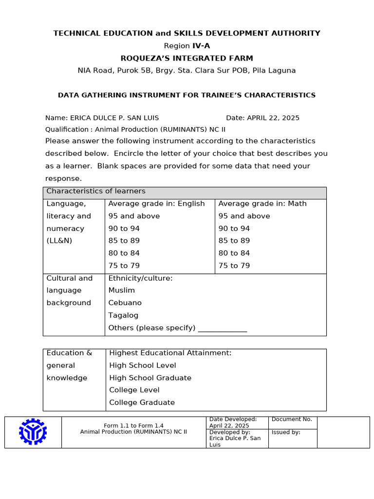 DATA GATHERING INSTRUMENT FOR TRAINEE’S CHARACTERISTICS