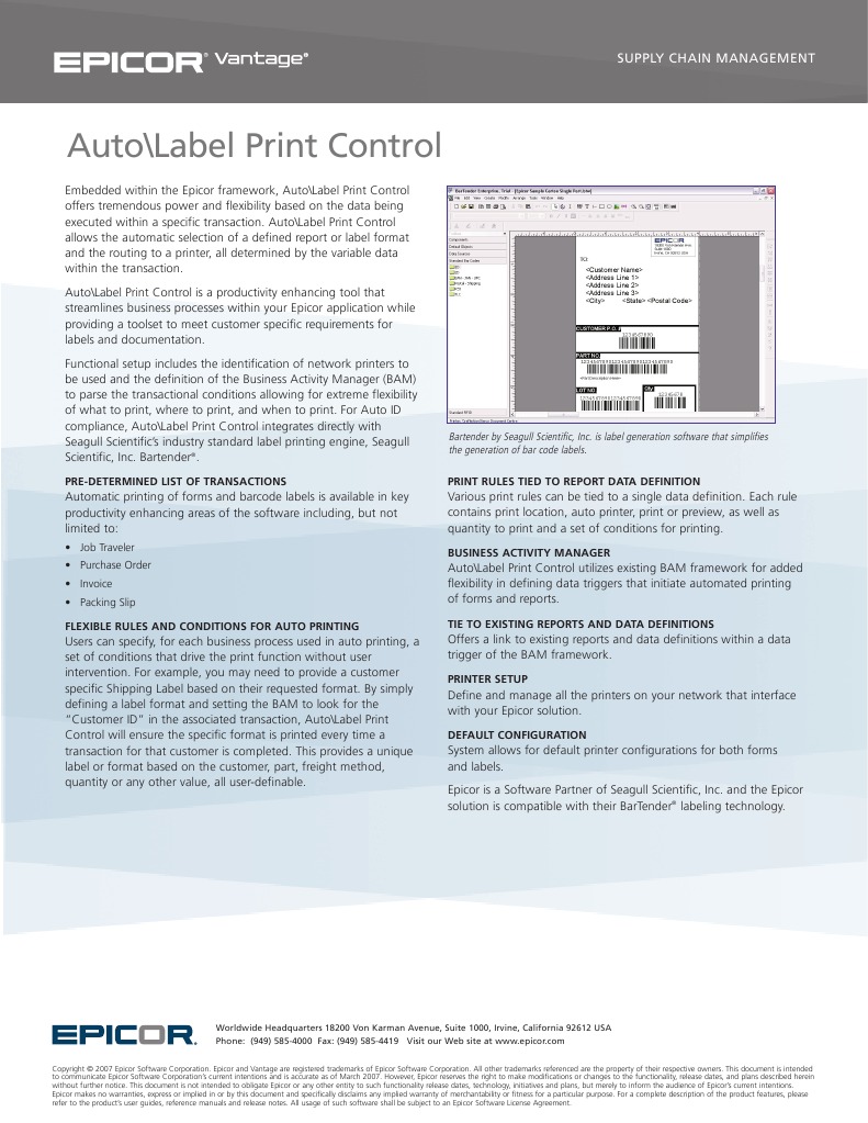 Embedded within the Epicor framework, Auto\Label Print Control offers tremendous power and flexibility based on the data being executed within a specific transaction. Auto\Label Print Control allows the automatic selection of a defined report or label format and the routing to a printer, all determined by the variable data within the transaction. Auto\Label Print Control is a productivity enhancing tool that streamlines business processes within your Epicor application while providing a toolset to meet customer specific requirements for labels and documentation. Functional setup includes the identification of network printers to be used and the definition of the Business Activity Manager (BAM) to parse the transactional conditions allowing for extreme flexibility of what to print, where to print, and when to print. For Auto ID compliance, Auto\Label Print Control integrates directly with Seagull Scientifics industry standard label printing engine, Seagull Scientific, Inc. Bartender.