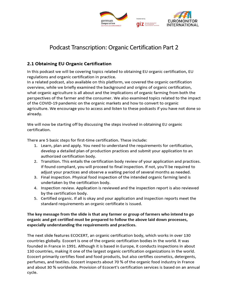In this podcast we will be covering topics related to obtaining EU organic certification, EU
