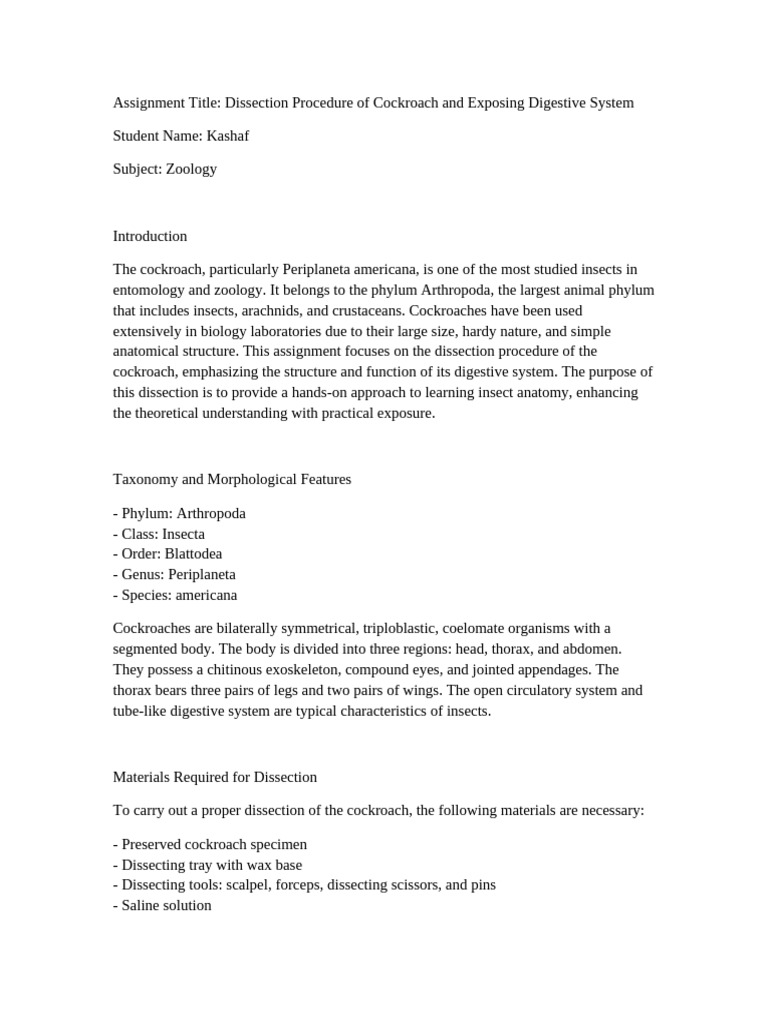 Assignment Title: Dissection Procedure of Cockroach and Exposing Digestive System