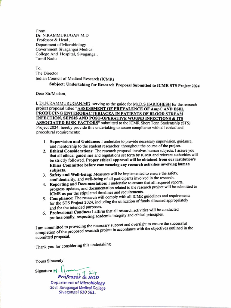 Subject: Undertaking for Research Proposal Submitted to ICMR STS Project 2024