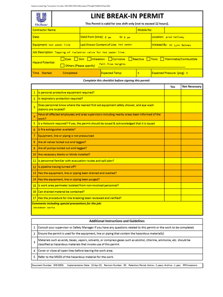 2 Ensure the permit is used for the equipment, line or piping that contain the hazardous material(s)