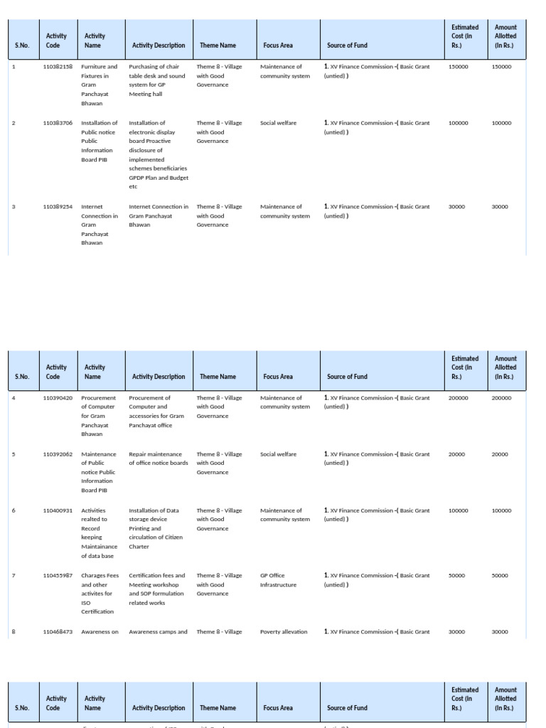 6 110400931 Activities Installation of Data Theme 8 - Village Maintenance of 1. XV Finance Commission -( Basic Grant 100000 100000