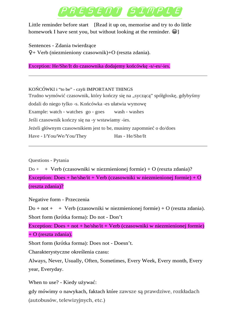 Exception: He/She/It do czasownika dodajemy końcówkę -s/-es/-ies.