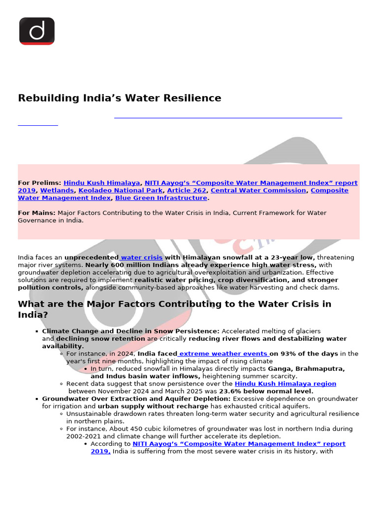 For Prelims: Hindu Kush Himalaya, NITI Aayog’s “Composite Water Management Index” report