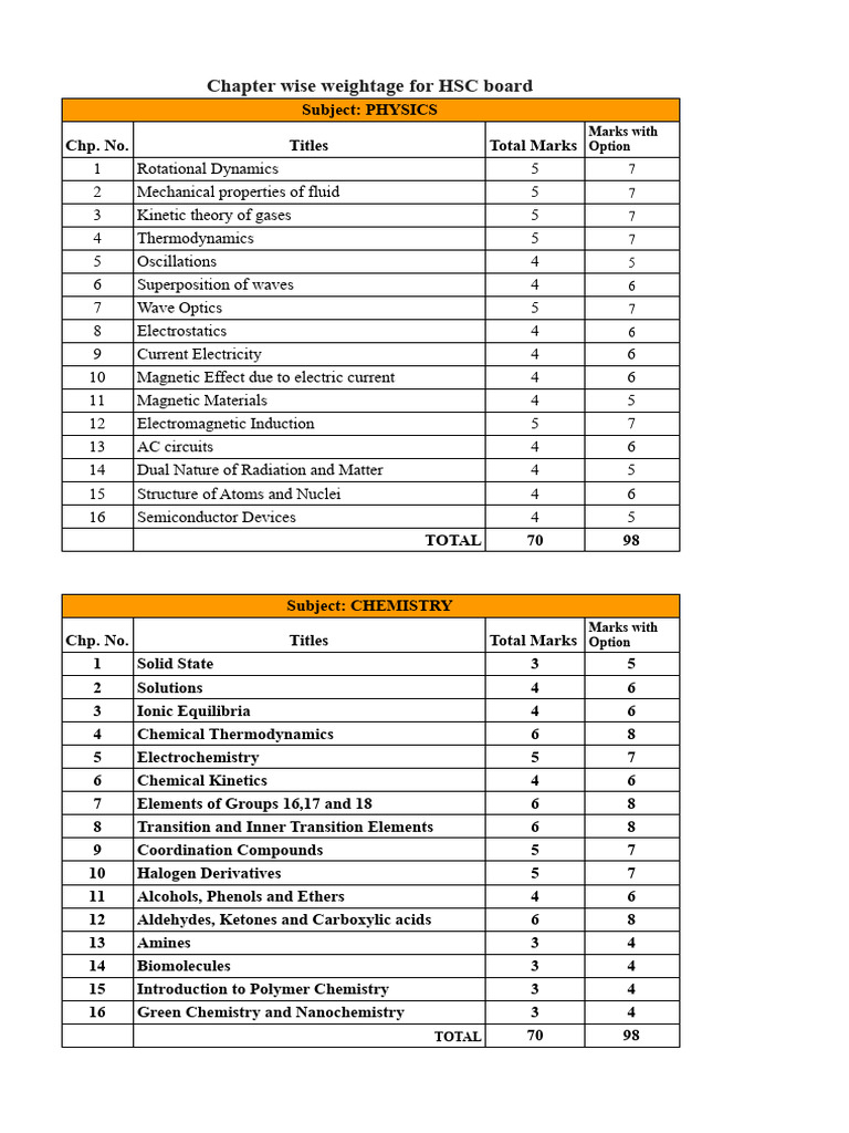 Chapter wise weightage for HSC board