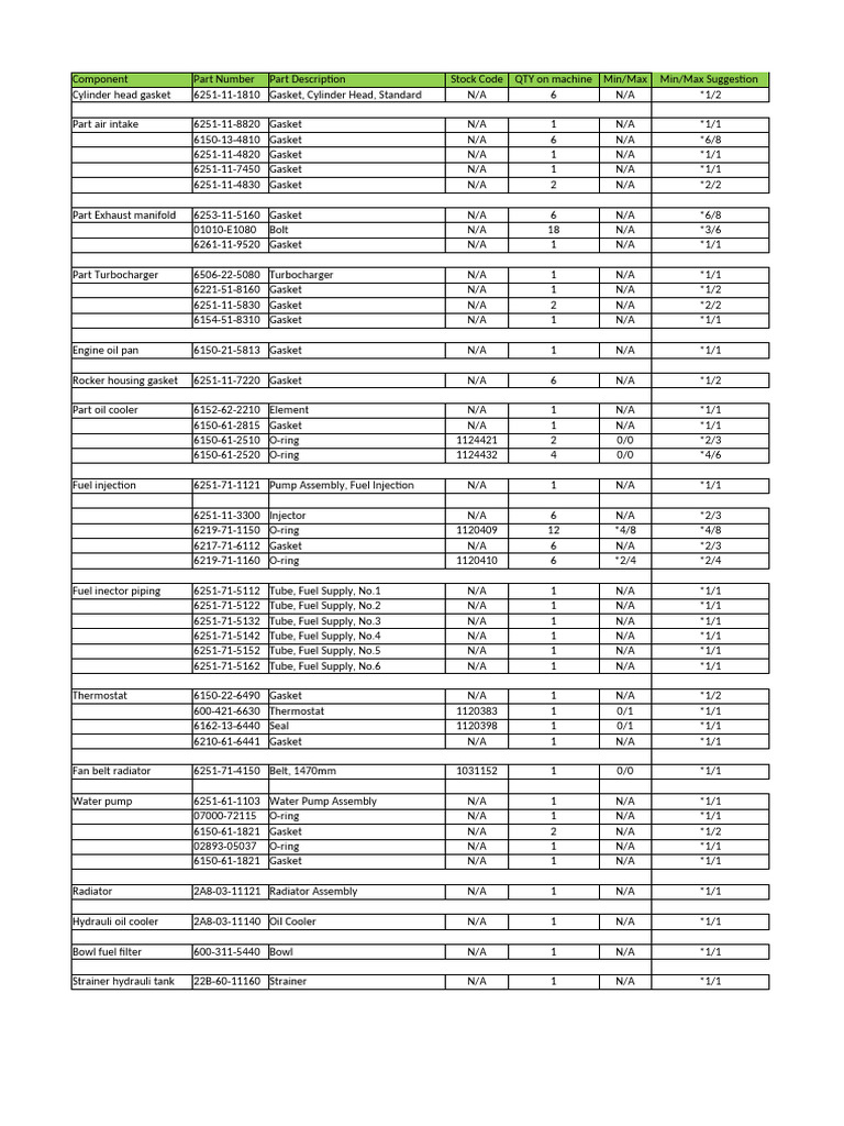 Component Part Number Part Description Stock Code QTY on machine Min/Max Min/Max Suggestion