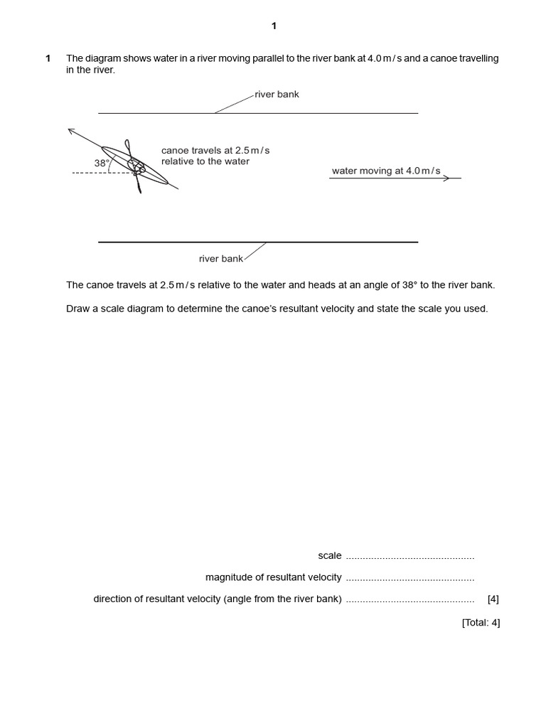 1 The diagram shows water in a river moving parallel to the river bank at 4.0 m / s and a canoe travelling