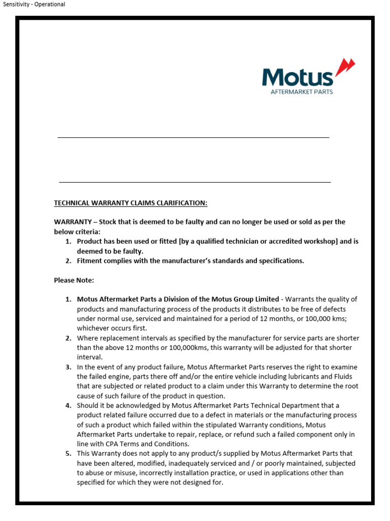 4. Should it be acknowledged by Motus Aftermarket Parts Technical Department that a