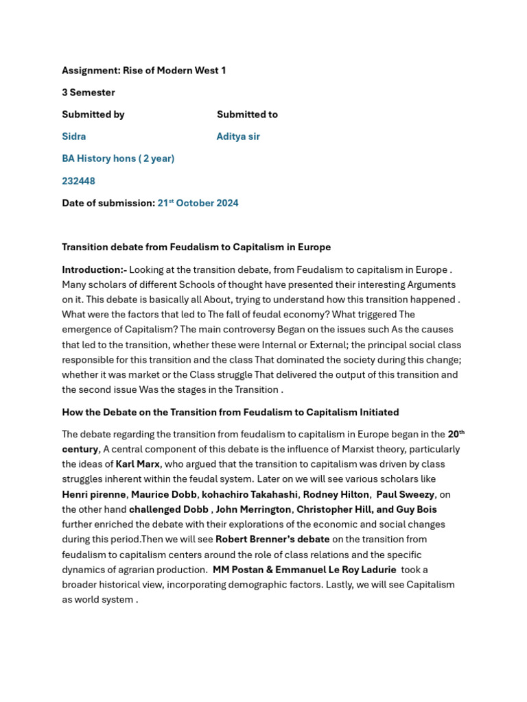 Introduction:- Looking at the transition debate, from Feudalism to capitalism in Europe .